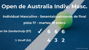 Botic Van De Zandschulp, neerlandés, número 57 de la ATP, cumplió los pronósticos al ganar en los sesentaicuatroavos de final del Open de Australia por 6-4, 6-3 y 6-2 en una hora y cincuenta minutos a Jan-Lennard Struff, tenista alemán, número 52 de la ATP. Con este resultado, seguiremos viendo al ganador del partido en los treintaidosavos de final del Open de Australia.