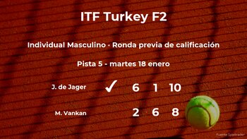 Jesse de Jager, neerlandés ganó en una hora y veintiun minutos por 6-2, 1-6 y 10-8 al jugador alemán Marlon Vankan en la ronda previa de calificación del torneo de Antalya. Con esta victoria, el tenista añade nuevos puntos a su ranking para participar en el torneo de Antalya.