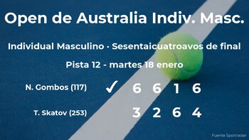 El jugador eslovaco Norbert Gombos, número 117 de la ATP, ganó en los sesentaicuatroavos de final del Open de Australia en dos horas y cincuenta y cuatro minutos por 6-3, 6-2, 1-6 y 6-4 a Timofey Skatov, tenista kazajo, número 253 de la ATP. Tras este resultado, el ganador estará en los treintaidosavos de final del Open de Australia.