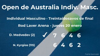 Daniil Medvedev, ruso, número 2 de la ATP y cabeza de serie número 2, cumplió los pronósticos al ganar en los treintaidosavos de final del Open de Australia en tres horas y dos minutos por 7(7)-6(1), 6-4, 4-6 y 6-2 al jugador australiano Nick Kyrgios, número 115 de la ATP. Tras este resultado, veremos al vencedor del partido en la siguiente fase del Open de Australia, los dieciseisavos de final.