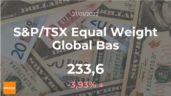 Teniendo en cuenta los últimos siete días, el S&P/TSX Equal Weight Global Bas marca una bajada del 4,76%; aunque en términos interanuales aún conserva una subida del 12,33%. El S&P/TSX Equal Weight Global Bas se sitúa un 6,8% por debajo de su máximo en lo que va de año (250,65 puntos)