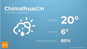 Mañana a primera hora en Chimalhuacán se prevén nubes y claros con lloviznas generalizadas e intermitentes. Por la tarde habrá nubes y claros con poca probabilidad de lluvias. Las temperaturas se moverán entre una máxima de 20 y una mínima de 6 grados. Además, se esperan vientos del sur de poca intensidad con valores de hasta 37 kilómetros por hora.