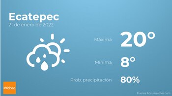 En las primeras horas de mañana en Ecatepec tendremos nubes y claros con lloviznas generalizadas e intermitentes. Por la tarde se prevén nubes y claros con poca probabilidad de precipitaciones. En relación a las temperaturas, estas se moverán entre una máxima de 20 y una mínima de 8 grados. Junto a todo esto, se esperan vientos de carácter débil con valores de hasta 44 km/h.