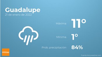 Mañana por la mañana en Guadalupe el cielo estará cubierto con lluvia. Según pasen las horas habrá más nubes que claros con baja probabilidad de que haya precipitaciones. En cuanto a las temperaturas, estarán entre los 11 grados de máxima y 1 de mínima. Viento del noreste de poca intensidad con cifras de hasta 20 km/h.