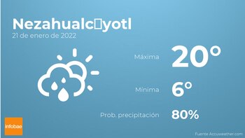 Mañana a primera hora en Nezahualcóyotl tendremos nubes y claros con lloviznas generalizadas. Según pasen las horas se prevén nubes y claros con poca probabilidad de lluvias. En relación a las temperaturas, estas variarán entre una máxima de 20 y una mínima de 6 grados centígrados. Junto a todo esto, se esperan vientos del sur de carácter débil con valores de hasta 32 km/h.