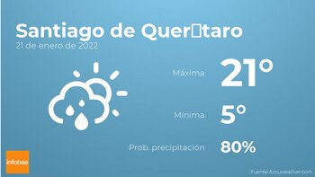 El pronóstico de mañana por la mañana en Santiago de Querétaro tendremos nubes y claros con alguna llovizna. Según pasen las horas se prevén nubes y claros con escasa probabilidad de precipitaciones. En relación a las temperaturas, estas variarán entre una máxima de 21 y una mínima de 5 grados centígrados. Viento de poca intensidad con valores de hasta 52 kilómetros por hora.