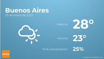 El pronóstico del clima para mañana en Buenos Aires habrá más nubes que claros con poca probabilidad de precipitaciones. Las temperaturas oscilarán entre una máxima de 28 y una mínima de 23 grados. En general, vientos del sureste sin apenas intensidad con rachas de hasta 43 kilómetros por hora.
