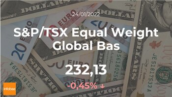 Día bajista para el S&P/TSX Equal Weight Global Bas, que terminó la sesión del lunes 24 de enero con ligeras bajadas del 0,45%, hasta los 232,13 puntos. El S&P/TSX Equal Weight Global Bas anotó la cifra máxima de 232,27 puntos y la cifra mínima de 220,39 puntos. El rango de cotización para el S&P/TSX Equal Weight Global Bas entre su punto más alto y el más bajo (máximo-mínimo) durante este día se situó en el 5,11%.