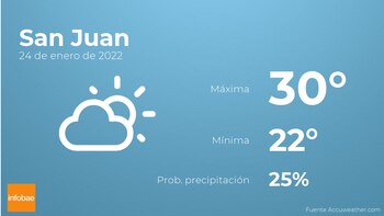 Mañana en San Juan se espera nubes escasas con poca probabilidad de precipitaciones. Por la tarde habrá nubes y claros con lloviznas generalizadas. En cuanto a las temperaturas, variarán entre una máxima de 30 y una mínima de 22 grados. En general, vientos de poca intensidad con valores de hasta 37 km/h.