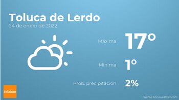 Mañana en Toluca de Lerdo se espera escasa nubosidad. En relación a las temperaturas, estas se moverán entre una máxima de 17 y una mínima de 1 grados. Junto a todo esto, se esperan vientos de poca intensidad con valores de hasta 43 km/h.