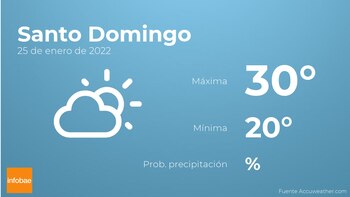 Mañana por la mañana en Santo Domingo habrá pocas nubes. Por la tarde tendremos cielos sin nubes. Por lo que respecta a las temperaturas, estas variarán entre una máxima de 30 y una mínima de 20 grados centígrados. Viento del este sin apenas intensidad con valores de hasta 26 kilómetros por hora.