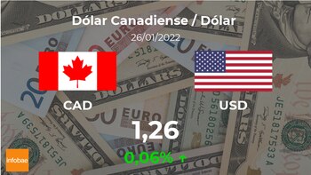 El dólar estadounidense se negocia a las 16:00 horas a 1,26 dólares canadienses, lo que implicó del 0,06% frente a la cifra de la jornada previa, cuando cotizó a 1,26 dólares canadienses.