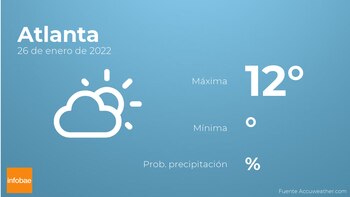 Mañana por la mañana en Atlanta habrá nubes escasas. Por la tarde tendremos nubes y claros. Además, se esperan vientos del norte de carácter débil con rachas de hasta 27 km/h.