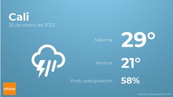 En las primeras horas de mañana en Cali tendremos cielos cubiertos con probabilidad de tormentas acompañadas de lluvia. Según pasen las horas el cielo estará cubierto con lloviznas generalizadas e intermitentes. Las temperaturas se moverán entre una máxima de 29 y una mínima de 21 grados centígrados. En general, vientos del norte de carácter débil con rachas de hasta 20 kilómetros por hora.