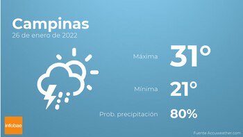 Mañana a primera hora en Campinas tendremos nubes y claros con tormentas acompañadas de lluvia. Según pasen las horas se esperan nubes y claros con escasa probabilidad de precipitaciones. Con respecto a las temperaturas, variarán entre una máxima de 31 y una mínima de 21 grados. Viento de carácter flojo con rachas de hasta 35 km/h.
