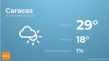 Mañana a primera hora en Caracas habrá más nubes que claros. Por la tarde se prevén nubes y claros. Por lo que respecta a las temperaturas, estas se moverán entre una máxima de 29 y una mínima de 18 grados centígrados. Junto a todo esto, se esperan vientos de carácter flojo con rachas de hasta 24 km/h.
