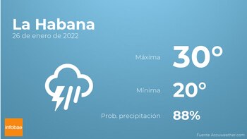 Mañana en La Habana el cielo estará cubierto con tormentas acompañadas de lluvia. Por la tarde tendremos nubes y claros con probabilidad de lloviznas generalizadas. Por lo que respecta a las temperaturas, estas variarán entre una máxima de 30 y una mínima de 20 grados. En general, vientos de poca intensidad con valores de hasta 30 kilómetros por hora.