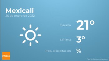 Para mañana temprano el clima en Mexicali se prevén cielos sin nubes. A medida que avance el día se esperan nubes y claros. En relación a las temperaturas, estas oscilarán entre una máxima de 21 y una mínima de 3 grados centígrados. Además, se esperan vientos del norte de poca intensidad con rachas de hasta 17 km/h.
