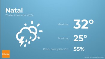 Mañana en Natal se esperan más nubes que claros con probabilidad de tormentas y lluvia. Según pasen las horas tendremos cielos cubiertos con tormentas y lluvia. Con respecto a las temperaturas, variarán entre una máxima de 32 y una mínima de 25 grados centígrados. En general, vientos de carácter débil con valores de hasta 46 km/h.