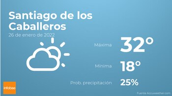Para Mañana en Santiago de los Caballeros se prevé nubes escasas con baja probabilidad de que haya precipitaciones. Según pasen las horas tendremos pocas nubes. Por lo que respecta a las temperaturas, estas se moverán entre los 32 grados de máxima y 18 de mínima. Además, se esperan vientos de poca intensidad con valores de hasta 30 kilómetros por hora.