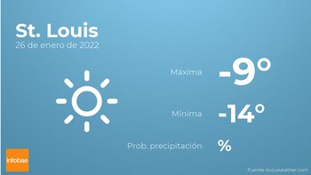 El pronóstico de mañana por la mañana en St. Louis se esperan cielos despejados. Por la tarde tendremos cielos despejados. En cuanto a las temperaturas, oscilarán entre una máxima de -9 y una mínima de -14 grados centígrados. Además, se esperan vientos de carácter débil con valores de hasta 22 km/h.