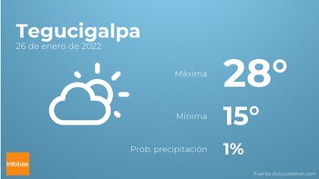 Para mañana temprano el clima en Tegucigalpa habrá escasa nubosidad. Por la tarde tendremos nubes y claros. Las temperaturas oscilarán entre una máxima de 28 y una mínima de 15 grados. Además, se esperan vientos de poca intensidad con cifras de hasta 43 km/h.