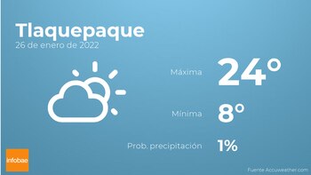 Para Mañana en Tlaquepaque habrá nubes y claros. En cuanto a las temperaturas, variarán entre una máxima de 24 y una mínima de 8 grados centígrados. Además, se esperan vientos de poca intensidad con rachas de hasta 28 kilómetros por hora.
