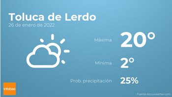 El pronóstico del clima para mañana a primera hora en Toluca de Lerdo habrá pocas nubes con poca probabilidad de lluvias. Según pasen las horas se espera nubes escasas. Con respecto a las temperaturas, estas se moverán entre los 20 grados de máxima y 2 de mínima. En general, vientos del sur de carácter débil con rachas de hasta 30 km/h.