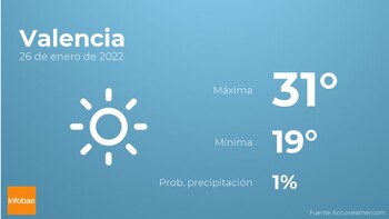 Mañana en Valencia se prevén cielos sin nubes. Por la tarde se espera escasa nubosidad. Por lo que respecta a las temperaturas, estas se moverán entre una máxima de 31 y una mínima de 19 grados. En general, vientos del norte de carácter flojo con valores de hasta 30 kilómetros por hora.