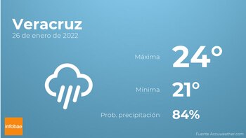 Para mañana temprano el clima en Veracruz se esperan cielos cubiertos con lluvia. Por la tarde estará muy nublado con poca probabilidad de lluvias. Las temperaturas estarán entre los 24 grados de máxima y 21 de mínima. Junto a todo esto, se esperan vientos del norte de carácter flojo con rachas de hasta 46 km/h.