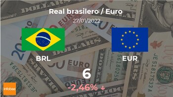 El euro se cotiza a las 16:00 horas a 6 reales brasileños, de modo que supuso un descenso del 2,46% si se compara con los 6,15 reales brasileños del día previo.