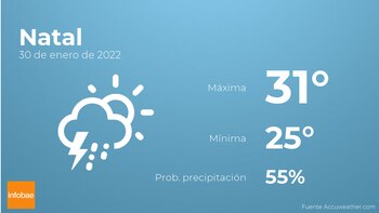 Mañana por la mañana en Natal se prevén nubes y claros con probabilidad de tormentas acompañadas de lluvia. Según pasen las horas el cielo estará cubierto con probabilidad de lluvia. Por lo que respecta a las temperaturas, estas oscilarán entre los 31 grados de máxima y 25 de mínima. Además, se esperan vientos de carácter débil con rachas de hasta 44 kilómetros por hora.