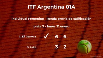 La jugadora argentina Chiara Di Genova dio la sorpresa al vencer en la ronda previa de calificación del torneo de San Miguel de Tucumán por 6-3 y 6-2 en una hora y treinta y cinco minutos a Sofia Luini, tenista argentina. Con este resultado, veremos a la jugadora en la siguiente ronda del torneo de San Miguel de Tucumán.