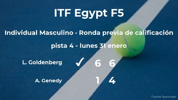 El tenista israelí Lior Goldenberg cumplió las previsiones al ganar en la ronda previa de calificación del torneo de Sharm El Sheikh en una hora y doce minutos por 6-1 y 6-4 a Abdullah Amr Mohamed Genedy, tenista egipcio. Con este triunfo, Goldenberg añade nuevos puntos a su ranking para participar en el torneo de Sharm El Sheikh.