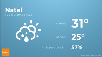 El pronóstico de mañana por la mañana en Natal habrá nubes y claros con probabilidad de lloviznas generalizadas. Por la tarde se esperan más nubes que claros con alguna llovizna. En cuanto a las temperaturas, estas se moverán entre una máxima de 31 y una mínima de 25 grados. Además, se esperan vientos sin apenas intensidad con rachas de hasta 41 km/h.