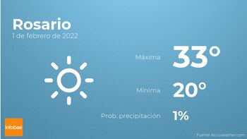 En las primeras horas de mañana en Rosario se prevén cielos despejados. A medida que avance el día habrá nubes escasas. Por lo que respecta a las temperaturas, estas se moverán entre una máxima de 33 y una mínima de 20 grados. Junto a todo esto, se esperan vientos de carácter débil con rachas de hasta 30 kilómetros por hora.