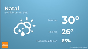 Mañana en Natal habrá nubes y claros con probabilidad de alguna llovizna. Con respecto a las temperaturas, estas oscilarán entre los 30 grados de máxima y 26 de mínima. Viento del este sin apenas intensidad con rachas de hasta 39 km/h.