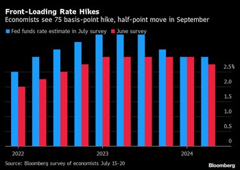 La encuesta a 44 economistas realizada del 15 al 20 de julio prevé que la Fed subirá las tasas otros 25 puntos básicos a principios de 2023, alcanzando un máximo de 3,75% antes de hacer una pausa y comenzar a recortar las tasas antes del final de dicho año.