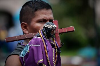Esta sábado los devotos abarrotaban la iglesia. Gente de todas las edades, muchos ataviados con prendas de color púrpura, se arrodillaba frente a decenas de velas para orar con los cerrados, en total concentración pese al ruido circundante.