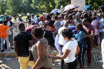 Ante la resistencia de los agentes, los haitianos empujaron las vallas metálicas para ingresar por la fuerza y, en medio de la turba, decenas de personas cayeron al suelo.