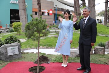 Antes de ingresar al estadio, la princesa sembró en sus jardines un árbol para conmemorar su visita, muy cerca de donde su hermana Mako, que abandonó la realeza para casarse con un plebeyo en 2021, sembró un pino en su visita del 2018 a Lima.
