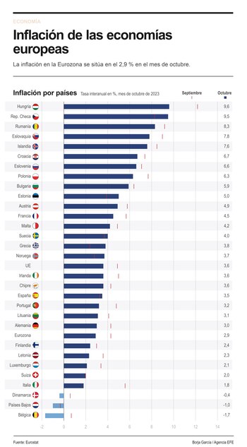 Bruselas, 17 nov (EFE).- La tasa de inflación interanual de la eurozona descendió en octubre hasta el 2,9 %, lo que supuso la cifra más baja desde julio de 2021, según informó este viernes la oficina de estadística comunitaria Eurostat.