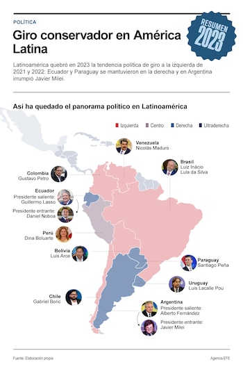 El ciclón de la izquierda que arrasó en Latinoamérica en 2021 y 2022 fue frenado también por Ecuador y Paraguay, dos países que ya se ubicaban en el espectro de la derecha y que se mantuvieron en el mismo lado del mapa político aunque, en el caso del país andino, el nuevo mandatario, Daniel Noboa, se posiciona más al centro que su antecesor, el conservador Guillermo Lasso.