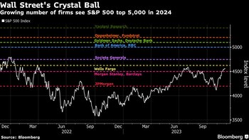 (Bloomberg) -- Justo un mes después de establecer el objetivo para 2024 del S&P 500, los estrategas de Goldman Sachs Group Inc elevaron sus pronósticos ya que el repunte de fin de año no muestra signos de disminuir.