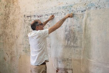 La primera consiste en la mencionada exhibición de partes de la pared de su taller extraídas con la técnica italiana de "strappo", utilizada para la restauración de frescos, y se vincula con la segunda, pues las telas pegadas con cola de conejo para extraerlas serán colgadas y conformarán "el velo".