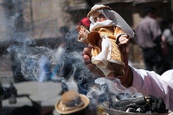 Juana Quispe Nina, es una mujer amauta, que aplica el sahumerio a las estatuillas del Niño de Jesús de la gente que se lo pide, relató a EFE.