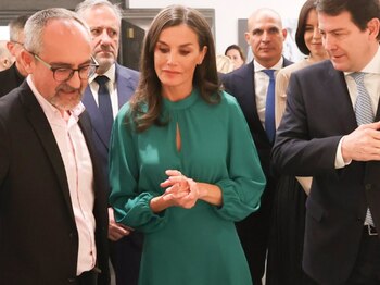 Primer compromiso de la semana para la Reina Letizia, que justo después de la escapada en solitario del Rey Felipe VI a Baqueira Beret con amigos, y mientras la Princesa Leonor celebra en Zaragoza el 142º aniversario de la Academia General Militar en la que está realizando su formación castrense, se ha desplazado hasta Salamanca para asistir a dos actos que reafirman su apoyo incondicional a la cultura. El primero de ellos, presidir la presentación del proyecto "Ciudad del español", que surge con la intención de innovar, actualizar, mejorar y reforzar la imagen de la ciudad castellano-leonesa como destino idóneo para el aprendizaje del español. Y a continuación, visitar la exposición del legado de la escritora Carmen Martín Gaite que se conserva en el Centro Internacional del Español de la Universidad de Salamanca (CIE-USAL), en el marco de la proclamación del premio "Arte 2024" de la Fundación Princesa de Girona -sustituyendo así a su hija mayor, que continúa centrada en su formación en las Fuerzas Armadas- en la segunda etapa del "Tour del talento" tras su paso por Lleida. Lejos de los look 'working girl' que ha escogido en sus últimas apariciones, la Reina Letizia ha apostado por un estilismo elegante y romántico a más no poder, protagonizado por el vestido verde esperanza con el que logró eclipsar a Mary de Dinamarca en su visita oficial a Copenhague el pasado noviembre. Cuatro meses después, su Majestad ha dedicido rescatarlo de su vestidor y lo ha lucido por primera vez en España, dejándonos verlo por fin de cerca y apreciar al detalle uno de los diseños más favorecedores que ha estrenado doña Letizia en los últimos tiempos. Por su color, en un verde esmeralda que no es de los más utilizados por la Reina -a pesar de que destaca sus ojos-, y por ser de una firma low-cost 'made in Spain' que también es una de las más utilizadas por la Princesa Leonor, Dándara. Un vestido midi que tiene un precio de 79.90 euros y que destaca por su cuello perkins, su escote lágrima, sus mangas abullonadas y una caída que se ajusta a la perfección a la silueta de doña Letizia, que hoy nos ha vuelto a conquistar. Un diseño versátil, delicado y muy favorecedor que ha complementado con el abrigo de paño tipo batín en color cámel que también escogió en su visita oficial a Dinamarca tras la publicación de las imágenes del ahora Rey Federico con Genoveva Casanova, con unos salones de piel de tacón sensato al tono -nos encanta la combinación con el verde-, su inseparable anillo de Coretterno y los pendientes de oro rosa, diamantes y una esmeralda en forma de lágrima de la firma 'Gold& Roses' que simulan ser un doble piercing.