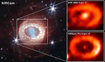El telescopio espacial James Webb (JWST) de NASA/ESA/CSA ha encontrado la mejor evidencia hasta el momento de la emisión de una estrella de neutrones en el corazón de una supernova registrada en 1987, detectable incluso a simple vista. La supernova, conocida como SN 1987A, se produjo a 160.000 años luz de la Tierra, en la Gran Nube de Magallanes. SN 1987A fue una supernova de tipo II que se observó en la Tierra en 1987, la primera supernova visible a simple vista desde 1604, antes de la llegada de los telescopios. De este modo, ha ofrecido a la comunidad astronómica una oportunidad única de estudiar la evolución de una supernova y lo que queda detrás, desde el principio. SN 1987A fue una supernova con colapso del núcleo, lo que significa que se espera que los restos compactados en su núcleo hayan formado una estrella de neutrones o un agujero negro. Durante mucho tiempo se han buscado pruebas de la presencia de un objeto tan compacto, y aunque anteriormente se han encontrado pruebas indirectas de la presencia de una estrella de neutrones, esta es la primera vez que se detectan los efectos de la emisión de alta energía de la joven estrella de neutrones. Las supernovas, la explosiva agonía final de algunas estrellas masivas, estallan en cuestión de horas y el brillo de la explosión alcanza su punto máximo en unos pocos meses. Los restos de la estrella en explosión seguirán evolucionando a un ritmo rápido durante las próximas décadas. Por lo tanto, las supernovas ofrecen una oportunidad muy rara para que los astrónomos estudien un proceso astronómico clave en tiempo real. La supernova SN 1987A se observó por primera vez en la Tierra en febrero de 1987 y su brillo alcanzó su punto máximo en mayo de ese año (aunque su distancia de la Tierra significa que el evento de supernova en realidad tuvo lugar unos 160.000 años antes). Fue la primera supernova que pudo verse a simple vista desde que se observó la supernova de Kepler en 1604. Aproximadamente dos horas antes de la observación visible de SN 1987A, tres observatorios de todo el mundo observaron una explosión de neutrinos que duró sólo unos segundos . Poco después se observó la luz visible de SN 1987A. Las dos observaciones diferentes se vincularon al mismo evento de supernova y proporcionaron evidencia importante para informar la teoría de cómo se producen las supernovas de colapso del núcleo. Esta teoría incluía la suposición de que este tipo de supernova formaría una estrella de neutrones o un agujero negro. Desde entonces, los astrónomos han buscado pruebas de la existencia de uno u otro de estos objetos compactos en el centro del material remanente en expansión. En los últimos años se han encontrado pruebas indirectas de la presencia de una estrella de neutrones en el centro del remanente, y las observaciones de remanentes de supernova mucho más antiguos, como la Nebulosa del Cangrejo, confirman que se encuentran estrellas de neutrones en muchos remanentes de supernova. Sin embargo, hasta ahora no se había observado evidencia directa de una estrella de neutrones después de SN 1987A (o cualquier otra explosión de supernova reciente). Claes Fransson, de la Universidad de Estocolmo y autor principal de este estudio, explica en un comunicado: "A partir de los modelos teóricos de SN 1987A, la explosión de neutrinos de 10 segundos observada justo antes de la supernova implicaba que en la explosión se formó una estrella de neutrones o un agujero negro. Pero no hemos observado ninguna firma convincente de un objeto recién nacido de ninguna explosión de supernova. Con JWST, ahora hemos encontrado evidencia directa de la emisión provocada por el objeto compacto recién nacido, muy probablemente una estrella de neutrones". Los hallazgos se publican en Science. Webb comenzó las observaciones científicas en julio de 2022, y las observaciones de Webb detrás de este trabajo se realizaron el 16 de julio, lo que convirtió al remanente de SN 1987A en uno de los primeros objetos observados por Webb. El equipo utilizó el modo Espectrógrafo de resolución media (MRS) del instrumento MIRI de Webb, que los miembros del mismo equipo ayudaron a desarrollar. El MRS es un tipo de instrumento conocido como Unidad de Campo Integral (IFU). Las IFU son instrumentos fascinantes que pueden tomar imágenes de un objeto y tomar un espectro del mismo al mismo tiempo. Una IFU forma un espectro en cada píxel, lo que permite a los observadores ver diferencias espectroscópicas en todo el objeto. El análisis del desplazamiento Doppler de cada espectro también permite evaluar la velocidad en cada posición. El análisis espectral de los resultados mostró una fuerte señal debida al argón ionizado del centro del material expulsado que rodea el sitio original de SN 1987A. En observaciones posteriores utilizando el otro IFU, NIRSpec (espectrógrafo de infrarrojo cercano) en longitudes de onda más cortas, el equipo encontró especies químicas aún más ionizadas, particularmente argón cinco veces ionizado (es decir, átomos de argón que han perdido cinco de sus 18 electrones). Estos iones requieren fotones de alta energía para formarse, y esos fotones tienen que venir de alguna parte. "Para crear estos iones que observamos en las eyecciones, estaba claro que tenía que haber una fuente de radiación de alta energía en el centro del remanente de SN 1987A", dijo Fransson. "En el artículo discutimos diferentes posibilidades, encontrando que sólo unos pocos escenarios son probables, y todos ellos involucran una estrella de neutrones recién nacida".