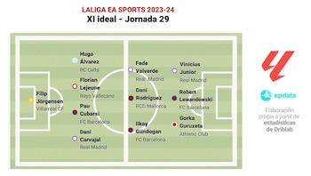 El polaco Robert Lewandowski, protagonista en la victoria del FC Barcelona ante el Atlético de Madrid con un gol y dos asistencias, y el brasileño Vinícius Junior, que volvió a marcar un doblete en el triunfo del Real Madrid ante Osasuna, lideran el once ideal de la jornada 29 de LaLiga EA Sports de Europa Press elaborado con las estadísticas de Driblab. El once completo lo integran Filip Jörgensen (Villarreal CF); Dani Carvajal (Real Madrid), Pau Cubarsí (FC Barcelona), Florian Lejeune (Rayo Vallecano), Hugo Álvarez (RC Celta); Ilkay Gündogan (Real Madrid), Dani Rodríguez (RCD Mallorca), Fede Valverde (Real Madrid); Gorka Guruzeta (Athletic Club), Robert Lewandowski (FC Barcelona) y Vinícius Junior (Real Madrid). Filip Jörgensen (Villarreal CF) El guardameta del Villarreal es el arquero de LaLiga EA Sports con más paradas realizadas, y en la victoria de los de Marcelino ante el Valencia fue clave. Jörgensen realizó siete paradas evitando 0,8 goles esperados, además despejó en tres ocasiones. Dani Carvajal (Real Madrid) El lateral diestro del Real Madrid está viviendo una de las mejores temporadas de su carrera deportiva. Ante Osasuna anotó su cuarto gol en Liga, y ya es su curso más goleador de su carrera. Además, participó en 73 acciones con balón, completó 42 pases, generó una ocasión y realizó cinco despejes. Pau Cubarsí (FC Barcelona) El joven central del FC Barcelona sigue demostrando que es una de las grandes irrupciones en el panorama europeo de la temporada. Ante el Atlético, en una de las grandes plazas del fútbol español como el Metropolitano, se salió. Completó 73 de los 77 pases que intentó, siete de ellos de larga distancia, generó una ocasión de gol, y en defensa, realizó seis despejes, bloqueó dos disparos, interceptó un pase y se impuso en el 75% de los duelos que disputó. Florian Lejeune (Rayo Vallecano) El defensor del Rayo Vallecano abrió el marcador con un gol de falta en la victoria de los madrileños ante el Real Betis. Además, en defensa, realizó siete despejes, bloqueó tres remates, interceptó dos pases y se impuso en el 75% de los duelos que intentó. Además, completó 20 pases y centró en una ocasión. Hugo Álvarez (RC Celta) El lateral zurdo del equipo gallego cuajó un gran encuentro ante el Sevilla, siendo de los más destacados de su equipo. En ataque, realizó 74 acciones con balón, completó 46 pases, generó tres ocasiones de gol, centró en dos ocasiones y completó cuatro regates. Además, se impuso en seis de siete duelos y despejó en dos ocasiones. Ilkay Gündogan (FC Barcelona) Ante la baja de Christensen, el alemán fue el encargado de colocarse en la posición de pivote en el Metropolitano, y cumplió con un partido sobresaliente. Gündogan fue la manija del equipo 'culer' completando 63 de los 69 pases que intentó, generó dos ocasiones de gol y realizó cinco centros. Además, se impuso en siete duelos y despejó en dos ocasiones. Dani Rodríguez (RCD Mallorca) El centrocampista del equipo bermellón fue el jugador más destacado en la victoria de los de Aguirre ante el Granada. Fue uno de los jugadores con más participaciones del partido con 55 acciones con balón, completó 18 pases, remató en dos ocasiones, generó dos ocasiones de gol, realizó 12 centros y completó dos regates. En defensa, se impuso en seis duelos, despejó un balón e interceptó un remate. Fede Valverde (Real Madrid) El mediocentro uruguayo del Real Madrid es una de las piezas clave del esquema de Ancelotti, y en la victoria de los blancos en El Sadar demostró el porqué. 'Hat-trick' de asistencias de Valverde y partidazo que completó con 49 pases acertados, cuatro ocasiones generadas, dos regates intentados, siete duelos ganados y dos pases interceptados. Gorka Guruzeta (Athletic Club) El delantero guipuzcoano del Athletic vive el mejor momento de su carrera, para fimar su temporada más goleadora en la élite hasta el momento, con 13 tantos, tras su doblete frente al Alavés. Además, Guruzeta remató en cuatro ocasiones, completó el 96% de los pases que intentó, generó una ocasión de gol, se impuso en cuatro duelos y centró en una ocasión. Robert Lewandowski (FC Barcelona) El delantero polaco cuajó ante el Atlético su mejor partido esta temporada. El ariete azulgrana participó en los tres tantos del equipo de Xavi, con un gol y dos asistencias. Además, realizó 35 acciones con balón, generó tres ocasiones de gol, completó dos centros, se impuso en cuatro duelos y recibió tres faltas. Vinícius Junior (Real Madrid) El extremo brasileño del Real Madrid sigue siendo el jugador que está tirando del carro en el ataque del líder de LaLiga EA Sports. Frente a Osasuna anotó dos tantos, y ya suma seis goles en los últimos cuatro partidos con el equipo blanco. Además, remató en cinco ocasiones, intentó seis regates de los que completó dos, acertó en 25 pases y se impuso en ocho duelos.
