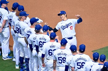 A Ohtani, que fue la principal firma de los Dodgers en el mercado de agentes libres y quien ha tenido que lidiar con un escándalo de apuestas deportivas, se le vio relajado.